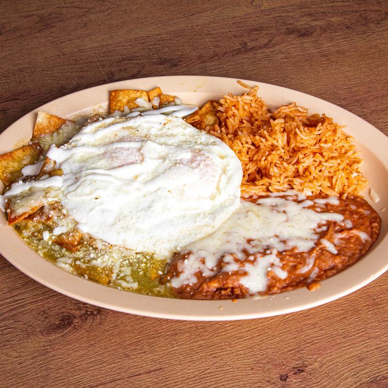 3 eggs with our house red or green sauce. Freshly made tortilla chips.
